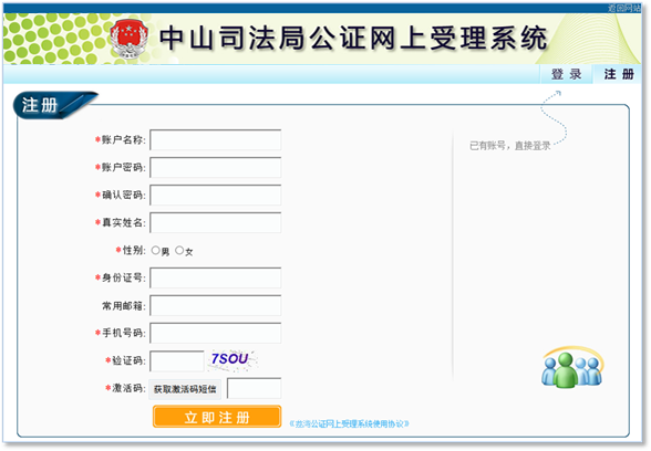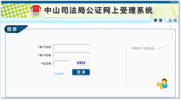 在相应位置输入账户名称、账户密码,与填入验证码,则点击登录进入系统。如果未注册,请点击右上方的“注册”按钮。
