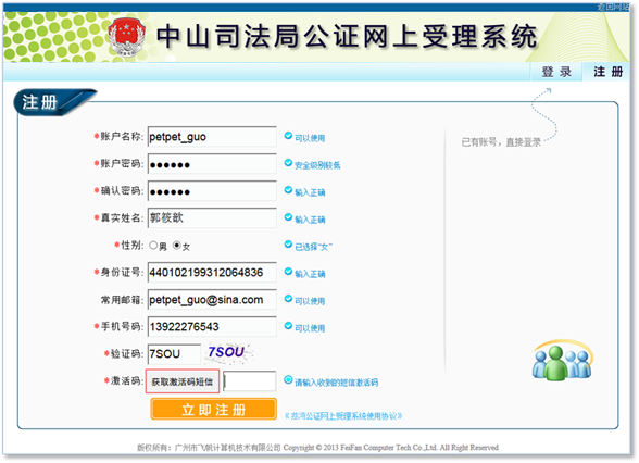 根据上图每一项的提示,填入注册信息。如账户名称与现有用户名称相同,则会出现相应提示。各项在输入时都有提示。最后一项请点击“获取激活码短信”按钮,系统将根据刚填入的手机号码发送验证信息,如图3所示。该号码务必填写正确,以便在系统内进行预约或受理操作时,正常接收到操作确认短信。