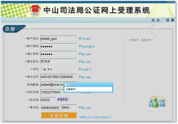 点击“立即注册”按钮,如以上项目都填写正确,系统会提示注册成功,如图4所示。