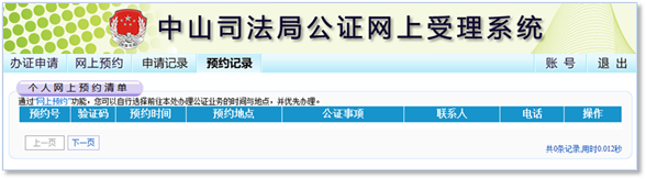 在此界面,可查看本人的历史预约记录。左上方有四个按钮,分别是“办证申请”、“网上预约”、“申请记录”、“预约记录”。目前已开通运行的功能是“网上预约”与“预约记录”。