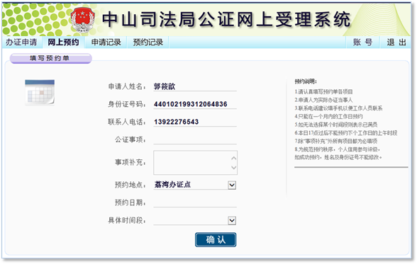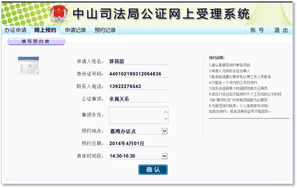 再次确认预约信息无误后,则点击下方“确认”按钮。系统将进行预约操作,此时,该账户的手机将会收到由公证网发出的预约确认短信,内容为预约时间、地点、验证码等。无需回复,仅供便捷翻查。