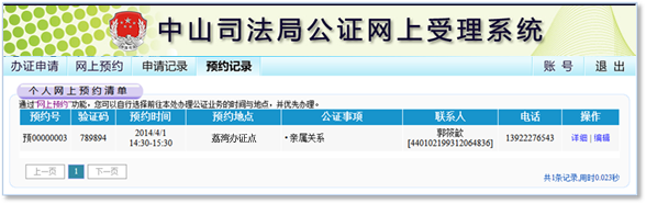 预约成功后,系统界面将返回“个人网上预约清单”界面,如图8所示。在该界面已经显示了刚预约的一条记录。