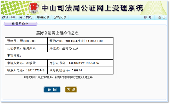 如上图所示,验证码请牢记,根据预约日期与时段到达公证处,可在排队机上直接输入预约验证码,领取叫号单。届时,如遇验证码错误,日期时段错误,多次取号等情况,排队机将会拒绝出号。因此,请按时到达公证处。