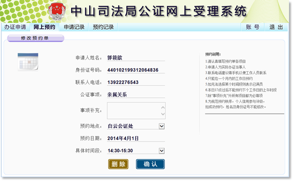 如果重新编辑该条预约记录,联系人姓名及身份证号码是不能修改的。右方“预约说明”第八条已有说明。其他信息修改完后点击“确认”即可完成修改。此时当前账号的注册手机将会收到预约信息修改的短信。
