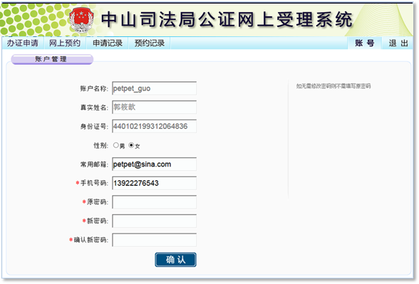 如图所示,出于本系统对用户的实名管理需要,该界面不能修改“账户名称”、“真实姓名”与“身份证号”,因此注册时必须填写真实信息。邮箱与手机等联系方式,可根据提示进行修改。密码无需修改则不用填。
